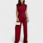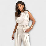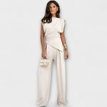 Eleganță sculpturală cu o notă modernă: Ansamblul Sophia combină un top asimetric cu pantaloni largi pentru o siluetă chic care curge grațios. Perfect pentru ocazii speciale sau pentru a-ți ridica fără efort look-ul de zi cu zi.