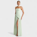 Rochia perfectă pentru a atrage priviri și a cuceri la fiecare pas. Decolteul său fără bretele și fanta laterală combină senzualitatea și sofisticarea, ideală pentru evenimente unde ești protagonista.